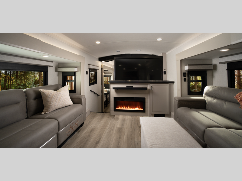 Sleeps 4 Slides 3 Length 36 ft Ext Width 8 ft 6 in Ext Height 13 ft 2 in Int Height 8 ft 6 in Interior Color Dune Gray Hitch Weight 2510 lbs GVWR 16000 lbs Dry Weight 13375 lbs Cargo Capacity 2625 lbs Fresh Water Capacity 75 gals Grey Water Capacity 87 gals Black Water Capacity 50 gals Tire Size 215/75R17.5"H Furnace BTU 40000 btu Available Beds King Refrigerator Type GE Residential Refrigerator Size 21 cu ft Cooktop Burners 4 Number of Awnings 2 LP Tank Capacity 40 lbs. Water Heater Type On Demand Tankless AC BTU 30000 btu TV Info LR 4K Smart LED HDTV, BR 32" 4K Smart TV Awning Info 10' and 16' Electric w/Integrated LED Lights Axle Count 2 Washer/Dryer Available Yes Number of LP Tanks 3 Shower Type Walk-In Shower Similar Floorplans
