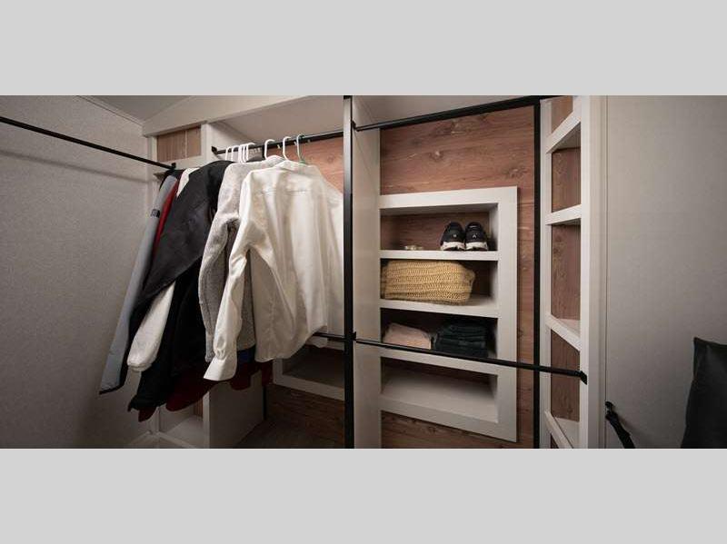 Step inside and find Residential, solid-surface kitchen and bathroom countertops paired with solid hardwood cabinetry, (made in USA) vinyl flooring, and LED accent lighting above the slide outs. You will appreciate the 102" wide body construction creating open living spaces, and each model includes a pass-through storage with Slam-Latch baggage doors so nothing needs to be left behind.