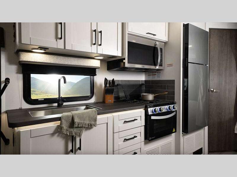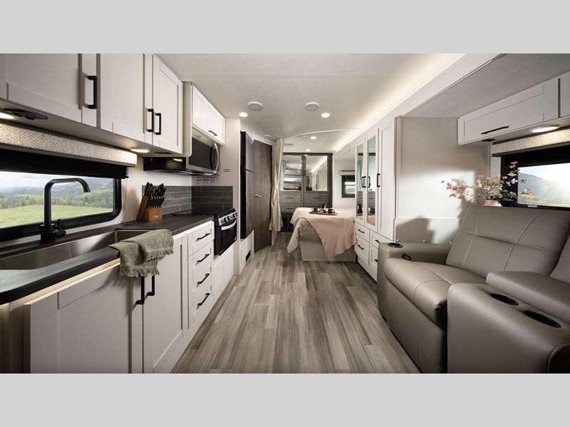 Each is built with a Stronghold VBL™ roof, floor, and sidewalls creating the lightest, yet strongest construction, and a one-piece, seamless fiberglass front cap that resists damage from moisture and debris. There are also aluminum running boards for easy entry into the cab and the main entrance which includes the industry's largest travel-view window and electric-powered step with an integrated house battery compartment. The interior offers seatbelts in all designed seating locations to protect your loved ones, hardwood cabinet doors and drawers for style and durability, high-intensity recessed LED ceiling lights and LED-lit slideout fascia, plus an interior command center and pleated blackout shades for privacy.