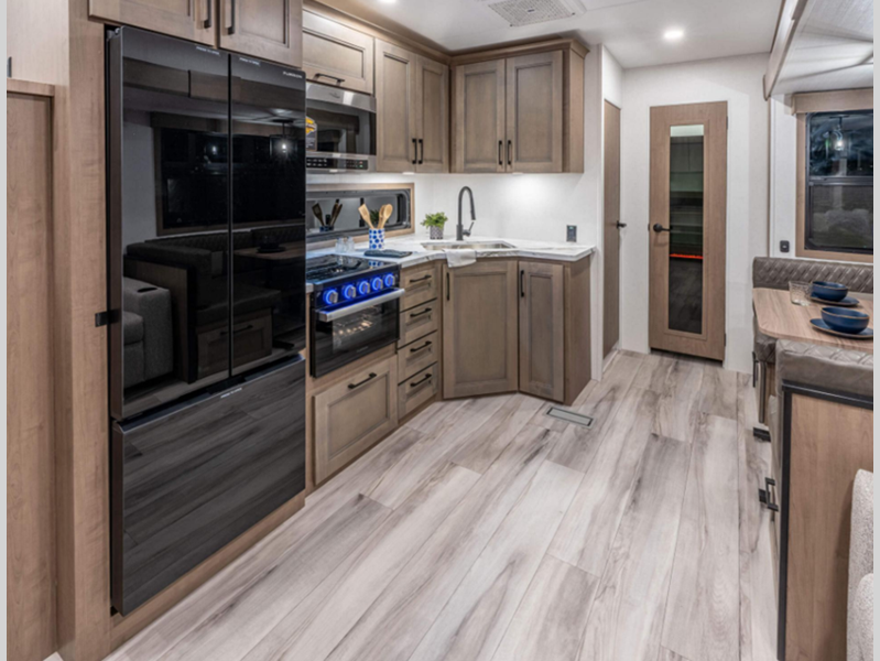 Sleeps 5 Slides 3 Length 33 ft 3 in Ext Width 8 ft Ext Height 12 ft 4 in Interior Color Mink, Pebble Exterior Color Polar White Hitch Weight 1590 lbs GVWR 11500 lbs Dry Weight 9490 lbs Cargo Capacity 2010 lbs Fresh Water Capacity 55 gals Grey Water Capacity 90 gals Black Water Capacity 50 gals Tire Size 16" Furnace BTU 35000 btu Available Beds Queen Refrigerator Type French Door Style Refrigerator Size 12 cu ft Cooktop Burners 3 Shower Size 30" x 36" Number of Awnings 1 Axle Weight 7900 lbs LP Tank Capacity 30 lbs Water Heater Type On Demand Tankless AC BTU 15000 btu TV Info LR 43" Smart LED TV, Ext. Smart LED TV. Awning Info 14' Electric with LED Lights Axle Count 2 Washer/Dryer Available Yes Number of LP Tanks 2 Shower Type Standard Electrical Service 50 amp Similar Floorplans