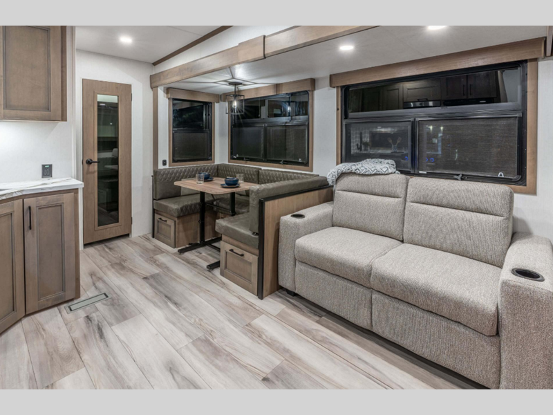 Sleeps 6 Slides 3 Length 34 ft 5 in Ext Width 8 ft Ext Height 12 ft 3 in Interior Color Mink, Pebble Exterior Color Polar White Hitch Weight 1610 lbs GVWR 11995 lbs Dry Weight 9850 lbs Cargo Capacity 2145 lbs Fresh Water Capacity 55 gals Grey Water Capacity 50 gals Black Water Capacity 50 gals Tire Size 16" Furnace BTU 35000 btu Available Beds Queen Refrigerator Type French Door Style Refrigerator Size 12 cu ft Cooktop Burners 3 Shower Size 30" x 36" Number of Awnings 1 Axle Weight 8240 lbs LP Tank Capacity 30 lbs Water Heater Type On Demand Tankless AC BTU 15000 btu TV Info LR 65" LED TV Awning Info 19' Electric with LED Lights Axle Count 2 Washer/Dryer Available Yes Number of LP Tanks 2 Shower Type Standard Electrical Service 50 amp Similar Floorplans